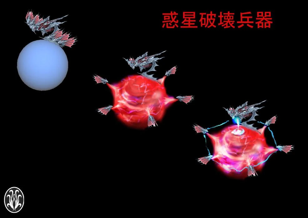 The schematic diagram of an attack by a large planet destroyer vessel, which is 30 kilometers long. After using the six ESP amplification units to contain the planet, a high-powered ESP from the main body will crush the planet in one hit.